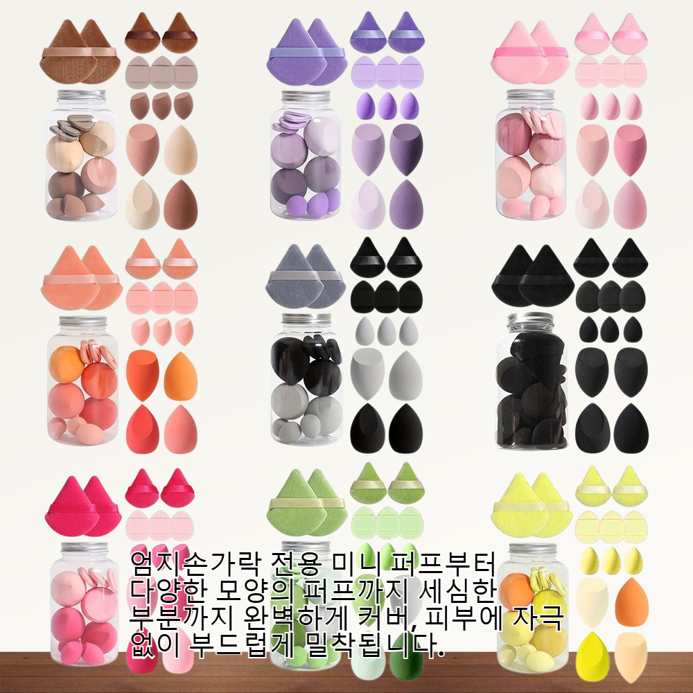 ● 엄지손가락 전용 미니 퍼프부터 다양한 모양의 퍼프까지 세심한 부분까지 완벽하게 커버, 피부에 자극 없이 부드럽게 밀착됩니다.